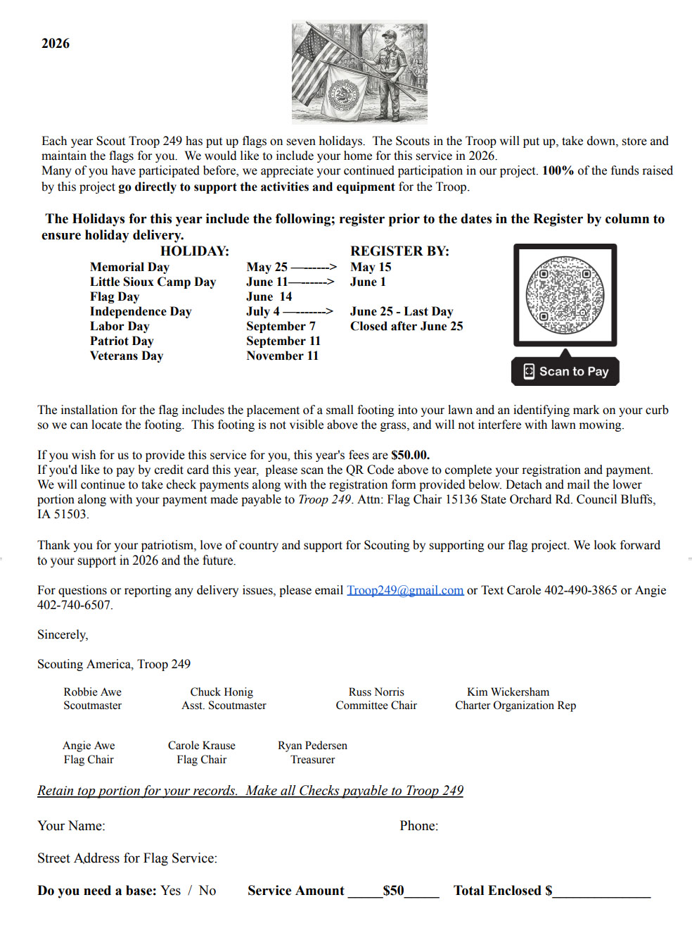 Please scan QR Code (QR Code is for registration only, not payment) and fill out the registration before mailing your payment to Troop 249. Detach and mail the lower portion along with $40.00 made payable to Troop 249 to 15136 State Orchard Rd, Council Bluffs, IA 51503, attn: Flag Chair, Carole Krause. Any questions please text or call either Carole @ 402-490-3865 or Angie @ 402-740-6507. You can email lctroop249@gmail.com as well..